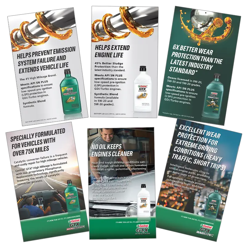 Print projects for Castrol Oil include in-store displays, oversize wall wraps, z-folds, brochures, print on demand, magazine spreads.